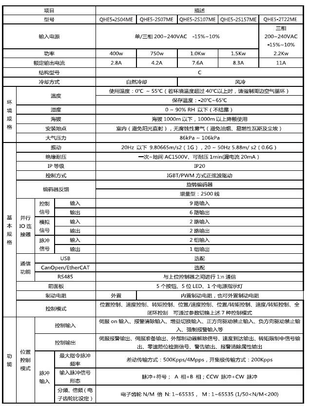 QHE5系列伺服驱动器产品是本公司结合市场需求研制的通用型交流伺服驱动器。该系列产品的功率范围为400~2.2KW,单/三相220V电压等级,具有丰富的通讯接口,可支持光电、旋变等多种编码器,采用先进的控制算法,能实现转矩、转速、位置精确的数字控制。大幅度提升伺服电机尺寸的对应性和产品特性的匹配度,可方便的替换其他品牌。